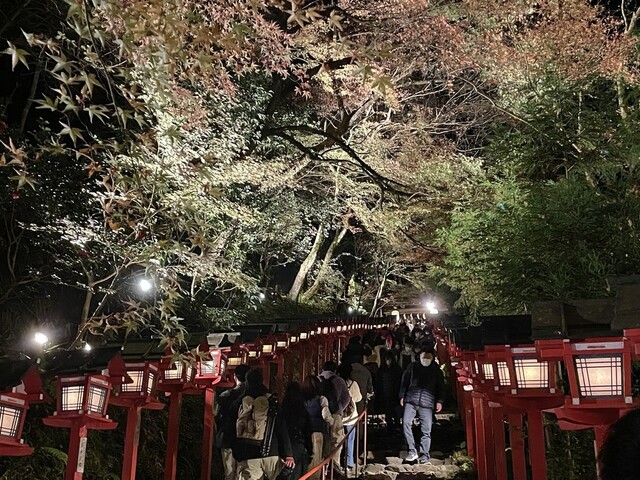 暗い夜道に、赤い提灯が趣を醸し出して、とても素敵です。