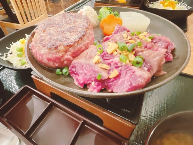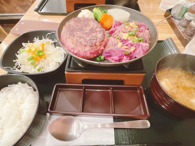 とろけるハンバーグと熟成ハラミステーキのコンボ+ライス・サラダ・味噌汁セット