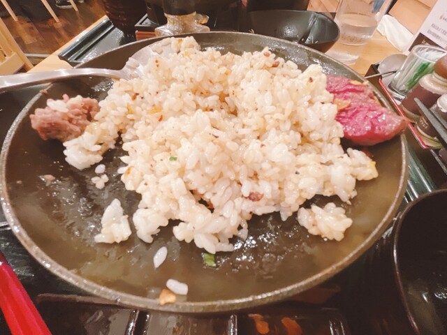 お肉を焼いた後の脂でご飯をガーリックパウダーで炒めて、ステーキソースをちょっと。