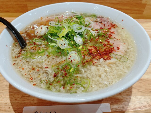 鶏がらスープに背脂チャッチャ。上から散らした刻んだ赤唐辛子に九条ねぎの緑が映えます。