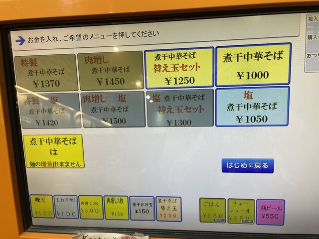 食券機で、煮干そばをポチ。あともうひと玉は、この日は煮干を味わいたかったので、替え玉でなく、かけ玉にしました。