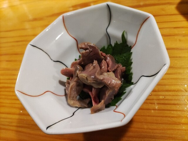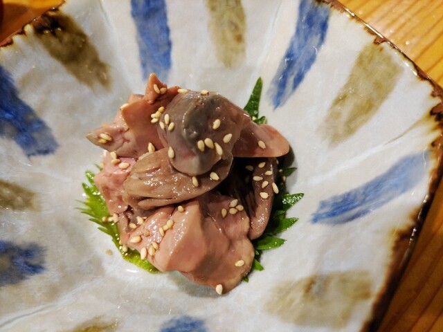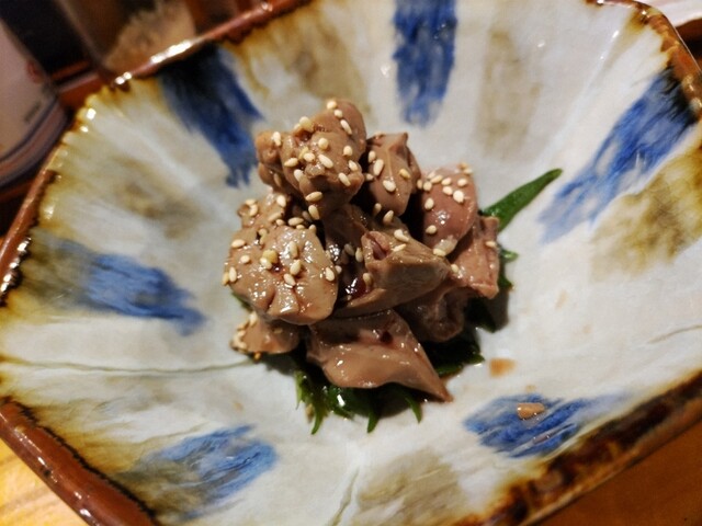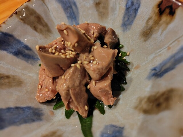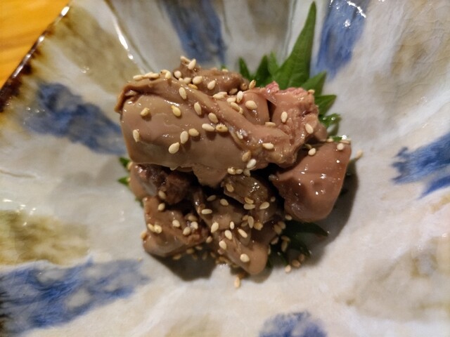 鶏レバーオイル漬けは甘みのある一品。レバーの癖もなく振りかけられたゴマの風味も良かったです。