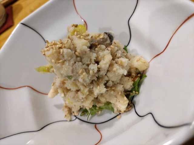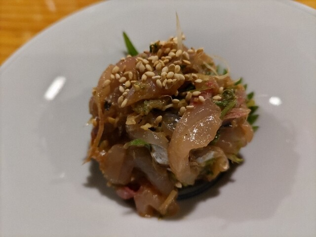 今回は『〆さば・白子天・なめろう・焼売・串揚げ・とり雑炊』を注文。出来上がり次第カウンター越しに出されました。