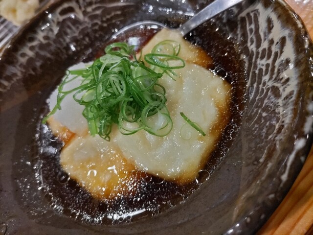 今回は『ゆば刺身・生ピーマン肉詰め・新玉アゲアゲポン酢・串揚げ(しいたけ・蓮根・玉葱)・鴨雑炊』を注文。出来上がり次第運ばれて来ました。
