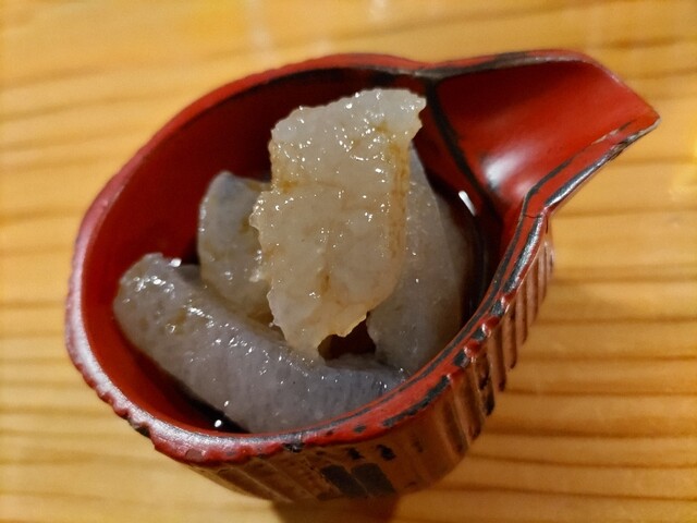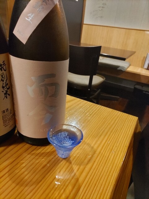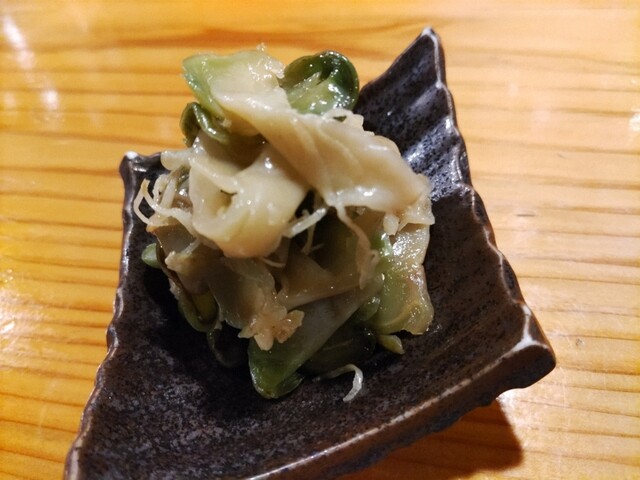 今回は『鶏レバーオイル漬け・くじら刺身・きゅうり一本漬け・ピータン豆腐・山菜天盛り合わせ・卯の花・鴨雑炊』を口頭で注文。出来上がり次第カウンター越しに出されました。