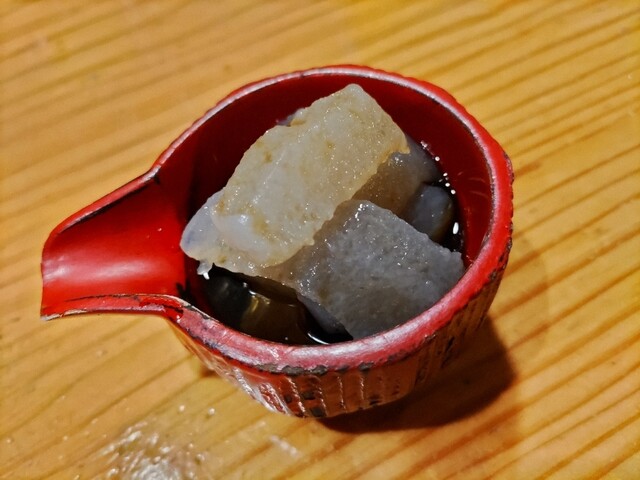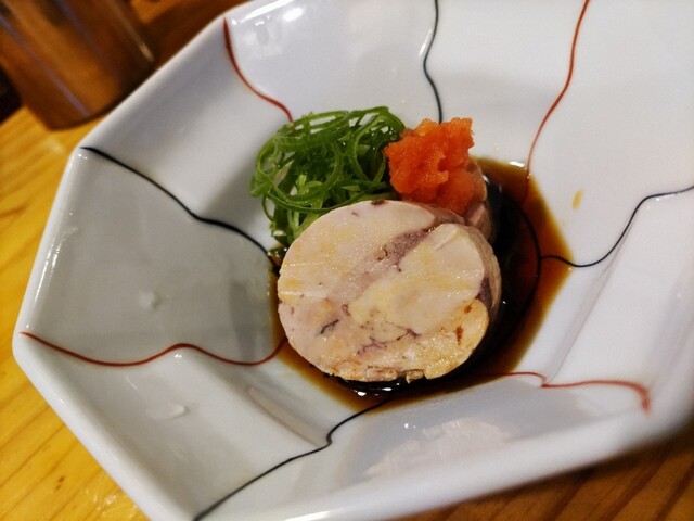 今回は『おでん(大根・ちくわぶ・がんもどき・ウインナー)・ハムカツ・白子コンフィ・あん肝・ポン酢・ブリ刺し・鴨雑炊』を口頭で注文。出来上がり次第運ばれて来ました。