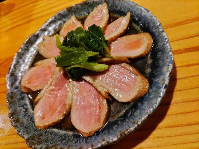 塩だれ炙り鴨もよく頼む1品。刻まれたにんにくを鴨肉で巻きながら