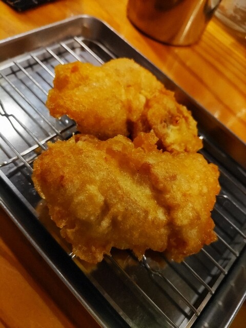 天ぷら鶏ももはカリカリジューシー。塩を降りつついただきます。2個で十分に楽しめました。