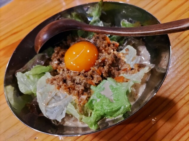 肉味噌サラダそうめんは初めて頼んだ一品。肉味噌と卵黄の濃厚さで良かったです。