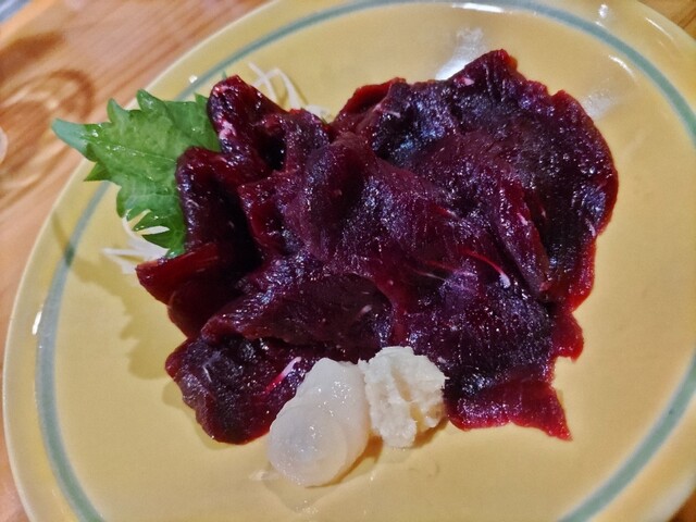 くじら刺身はクセの無い一品。にんにくをつけていただきました。美味しかったです。