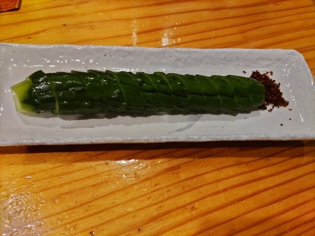 今回は『胡瓜一本漬け・おつまみ三点盛り・焼きエリンギ・銀ダラ西京焼き・おでん(大根・水餃子・さつま揚げ)』を口頭で注文。出来上がり次第運ばれて来ました。