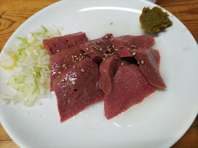 レバトロ刺しは注文してから時間のかかる一品。先におつまみと焼き物を頼んで待っていると丁度よく提供。ゴマ油で美味しくいただきました。