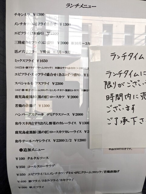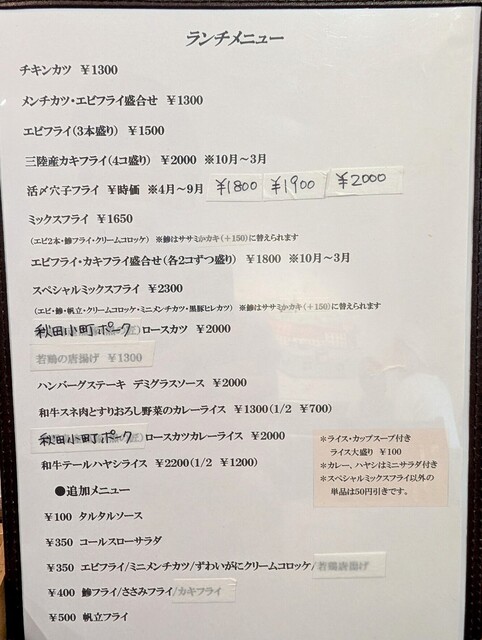 特にエビフライ・メンチカツが圧倒的に美味しく、この2品は個人的にここより美味しいお店を知りません。とは言え、他店とは味や系統が違うので「ここのフライを食べると他店で食べられなくなる」ということもなく、他店との系統の違いもそれぞれ楽しめると思います。アジフライも最上の出来具合で、これもまたリピートしたくなる1品となりました。どれも感動的な美味しさでした。