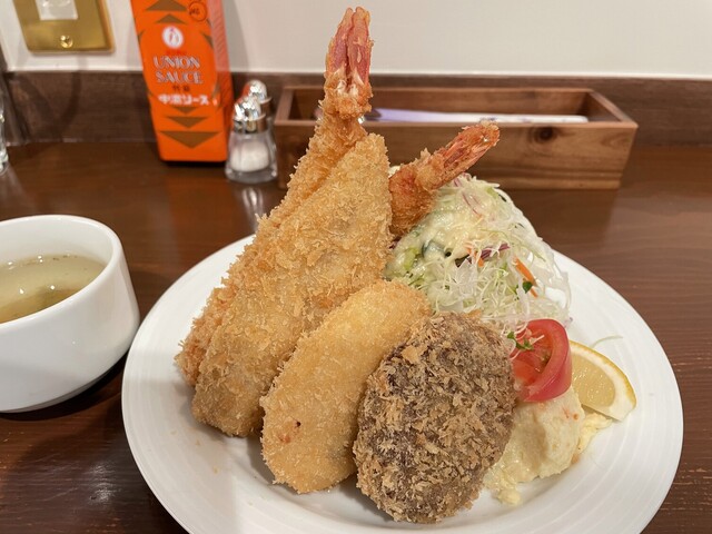 今回はミックスフライ+ミニメンチカツ、ライス抜きでお願いしました。先にスープが提供された後、オーダー後10分ほど待って料理が提供されました。店内が狭く小さくなったこともあり、以前のようにスープをこまめに片付ける対応もなくなりました。