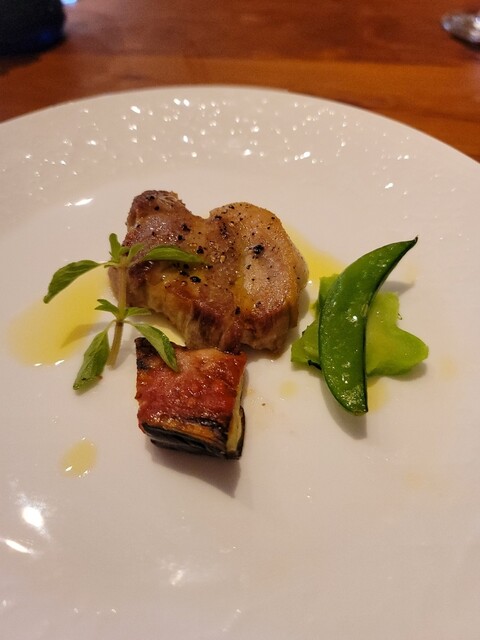 前菜、切りたての生ハム乗ったサラダ、季節の野菜のスープ、パスタ、豚のロースト、デザート