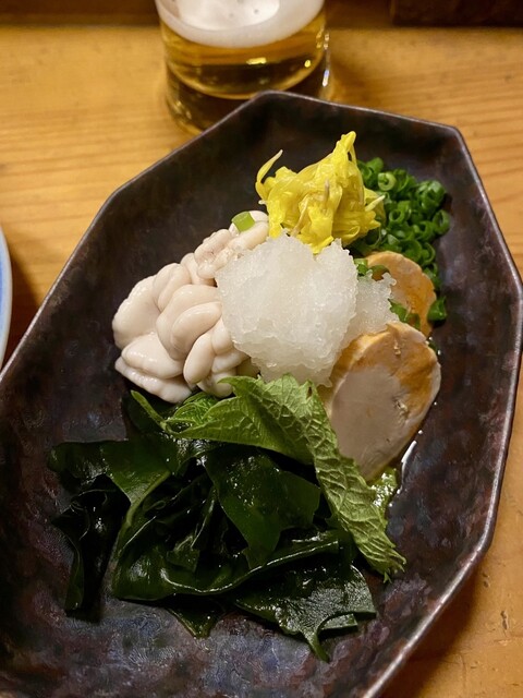 まず焼き貝とツルムラサキのお浸しという、ステキなお通しにうっとり。エアコン冷えした体に熱い貝汁が沁みた。