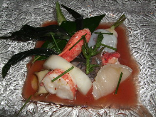 冷たいジュレの上に海鮮(ホタテ等)が載っています。さっぱり美味しくいただきました。