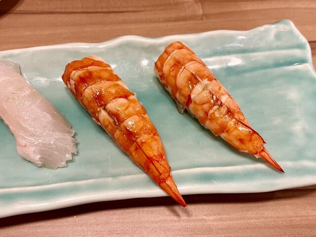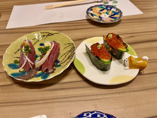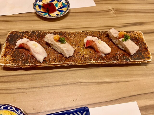以前から訪問したかった、【銀寿司】にカミさんの誕生日祝いを兼ねて、年に一度の贅沢ディナー(^.^)夜はコースのみなので、今回、奮発して「料理長おまかせ15000円コース(一人あたり)」を予約し、別途、花束を用意してもらったまずはお酒と一緒に前菜と箸休めの糠漬けが提供され、前菜などの内容にテンションも上がる( ^ω^ )前菜・糠漬けをつまみながら、料理を待っていると、大皿の刺し盛りが置かれ、豪勢過ぎる内容に驚きと感動で、しばらく鑑賞タイム(@_@)‼︎そのため、お店スタッフから産地の説明をしていただくも、内容が入らずσ(^_^;)気持ちも落ち着き、一つ一つのお刺身に感動しながら味わっていると、焼物やズワイカニなど次々と料理が提供され、更に圧倒されてながらも、日本酒と共に十二分に味わい、二人でまったりしたところで、お寿司の提供‼︎丁寧に握られたお寿司は醤油に付けずにいただけ、シャリが少なめなのでありがたい( ^ω^ )もうこれ以上食べられ無いくらい、お腹も一杯になったところで、バースデイカードと一緒にデザートのアイス。メロンと柚子のアイスでお口をサッパリ‼︎ 温かいお茶をいただき、お腹も落ち着いたので、お会計をしてお店を出ると、綺麗なアジサイが目に入り、外観も素敵なお店(^_^)今後も特別な日には利用したい( ◠‿◠ )