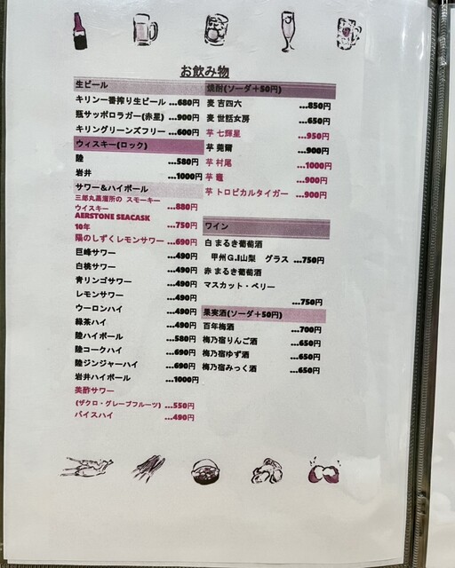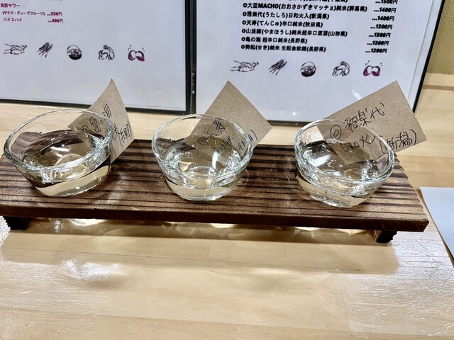「瓶サッポロラガー(赤星)」、「日本酒飲み比べセット(亀の海・天寿・雅楽代)」、「三郎丸蒸留所のスモーキーウイスキー(ハイ・ボール)」に「山法師」