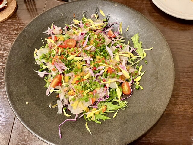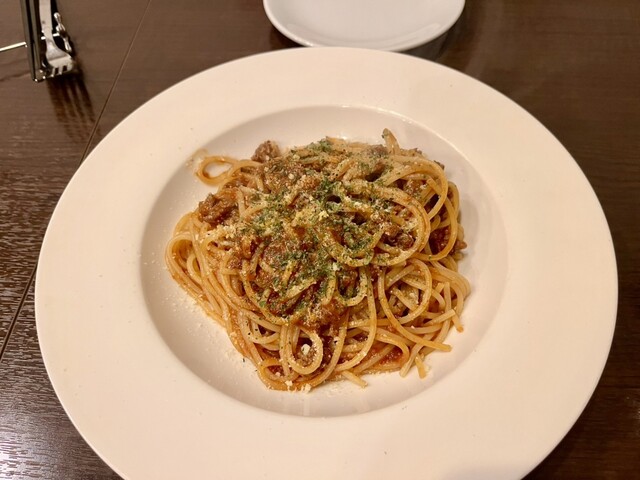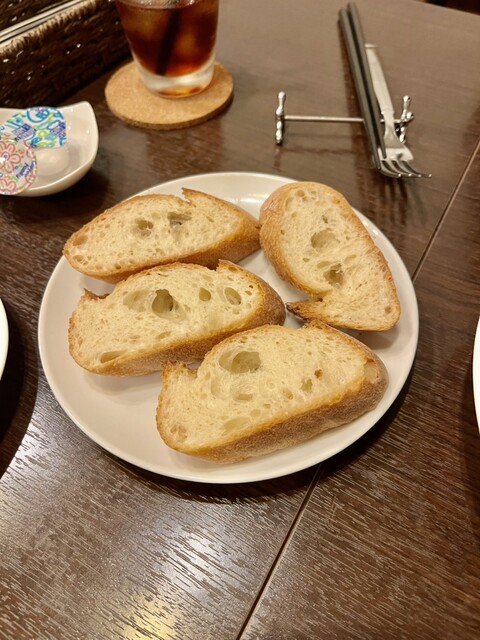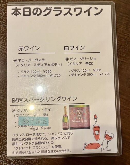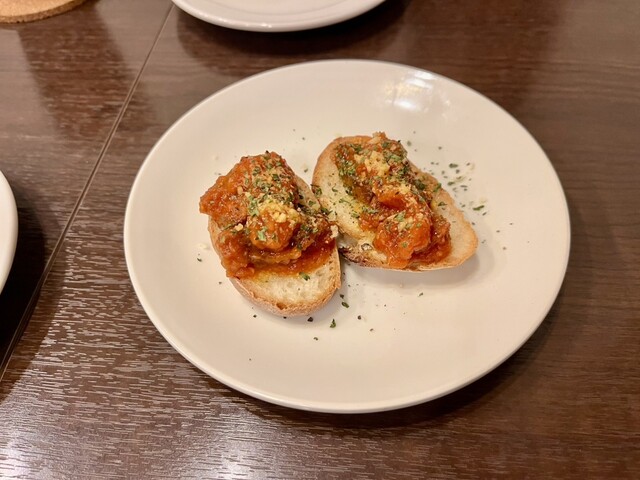 新天地でも既に地元の方々から支持されているようで、近隣に住む方々がディナーを楽しみに数組訪問して来ており、お会計時にはテーブルは全て埋まって大盛況(^-^)夜訪問は初めてもあり、黒板メニューのオススメから、「本日のブルスケッタ」に「真鯛の昆布〆カルパッチョ」に「山形豚のステーキ」を注文!「キリンラガー」で喉を湿らせ、その後は本日のグラスワイン(赤)、「ネロ・ダーヴォラ」のデキャンタと共に、「仔羊のボロネーゼスパゲッティ」と「バケット」で楽しみ、ワインがまだ残っていたので、「栗豚ウィンナー」を頼み、お酒を味わっている間に、カミさんは「巨峰シャーベット」を堪能( ^ω^ )以前と同様、食べた料理は全て美味しく、また定期的訪れたいお店o(^▽^)oいつかは店主とプロレスの話しをしてみたい(^o^)
