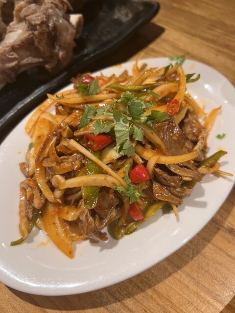 ・四川風羊ホルモン和え(1078円)よだれどり的なほのかに甘みもあるタレの冷菜。たまにめちゃくちゃ辛い唐辛子に当たると死ぬけど最高すぎた!