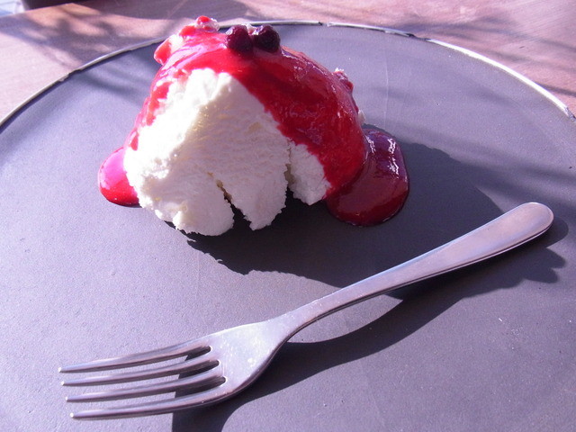 我慢できずに、お店の外にある木でできたベンチ&テーブルで、早...