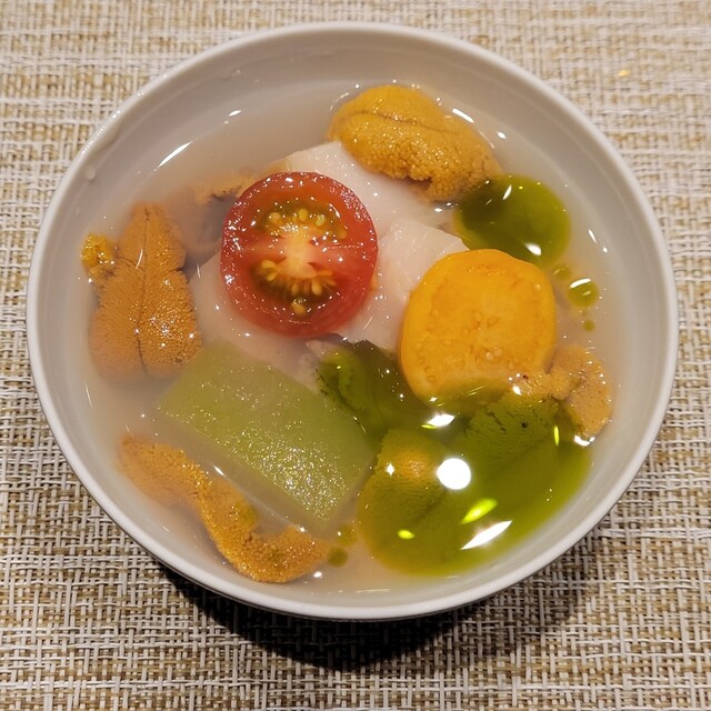 低温で蒸された鮎魚女と賀茂茄子、揚げたトマト、北海道産の雲丹と一緒にフュメドポワソンのスープ仕立てで。
