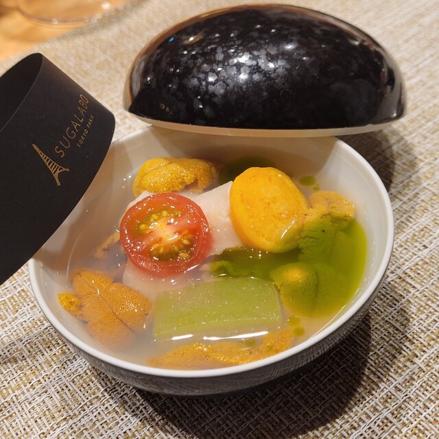 毎月の食材探しの旅で見つけた極上の食材が集まるイノベーティブ・フュージョン「SUGALABO」は、次世代のフレンチを味わえるラボラトリーとして世界から注目を浴びている。秘密の入口をくぐった先は、独創的な世界観が広がる美食空間。革新的な仕掛けが施された極上の一皿は、ゲストの食欲だけでなく知的好奇心も充たしてくれる。食を通して伝わってくるシェフの強い想いや、料理が紡ぐ物語も汲み取りたい。』とのこと。