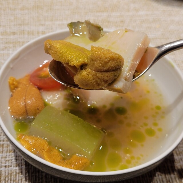 鮑のエキスたっぷりのスープに満たされた、やわらか仕上げの鮑の身、とろける雲丹、トロトロの冬瓜、ミニトマトと鬼灯のアクセントと、得も言われぬハーモニーを堪能させていただきました(*´▽`*)