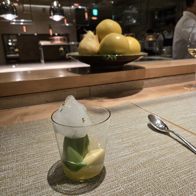 水晶文旦とミントのソルベ、桂花陳酒のゼリー、レモンのクリーム、文旦とレモンの泡とさっぱりと美味しく楽しませていただきました(・∀・)イイネ!!