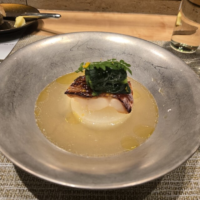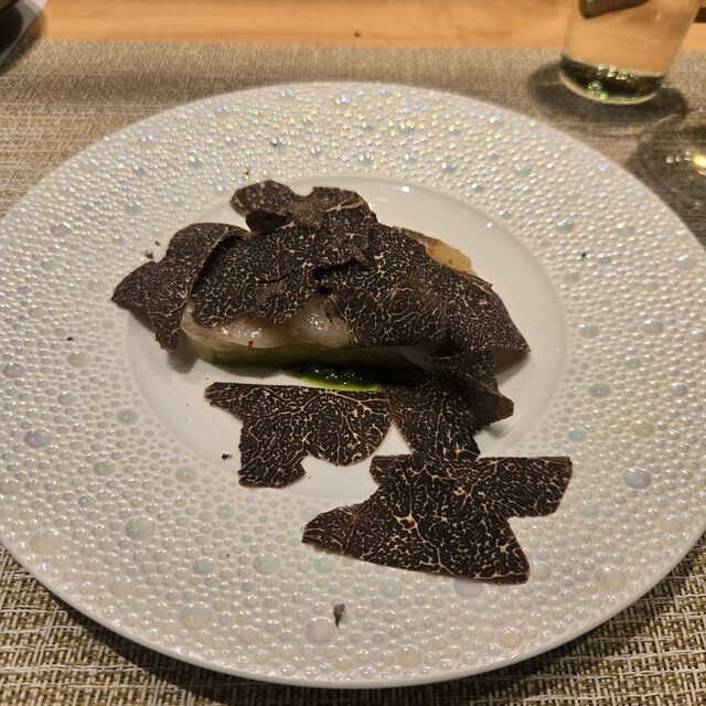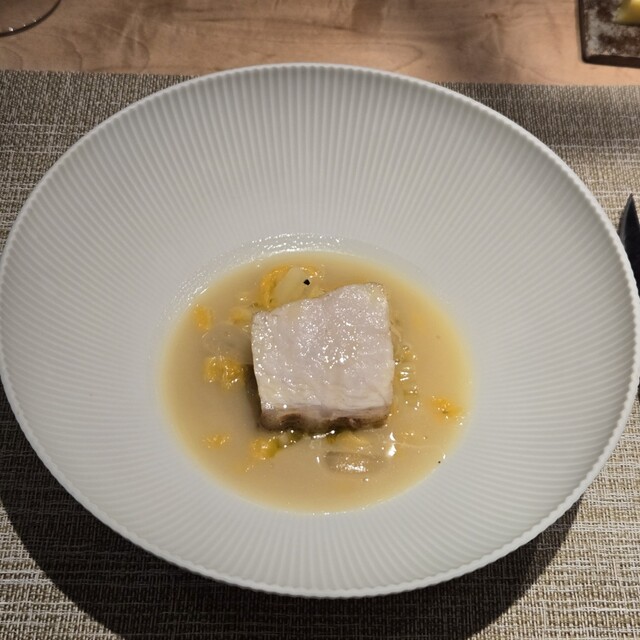 黒トリュフの芳醇な香りにテンションが上がり、しっとりフワフワのクエの旨味を、クエの出汁、白菜やオレンジ、アンチョビなど織り成す味わいがさらに昇華さらてくれており、控えめに言って、絶品でございました(*>∇<)ノ