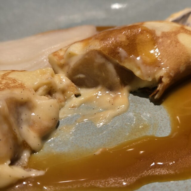 1か月追熟されているというル・レクチェは瑞々しく糖度抜群、モチモチのクレープ生地の中にも火入でしっとりとして存在、柑橘類のソースが爽やかに堪能させていただきました(*^▽^*)