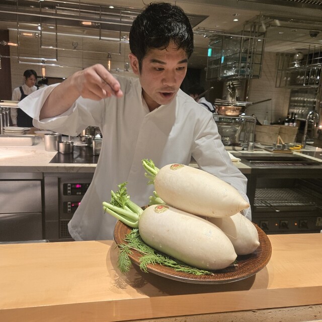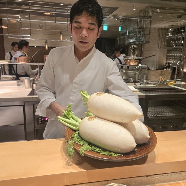 フランス産の高級なオマールブルーと福岡県糸島の野菜やトラキさんの小蕪を使った映える1皿。