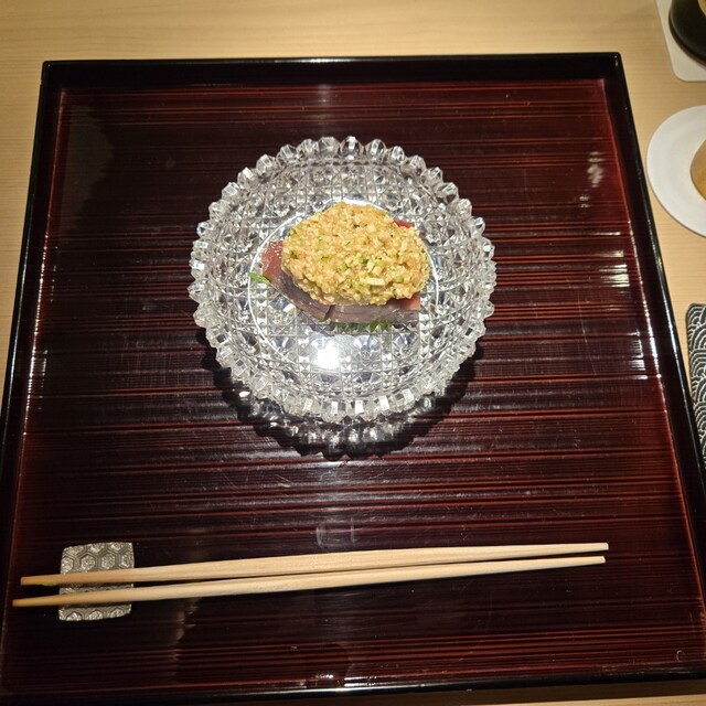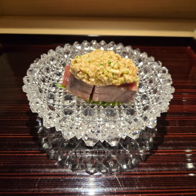 千葉県勝浦産の鰹は漬けにして、上には山形のだしのイメージの山芋、葱、みょうがを刻んだものが合わせてありました。