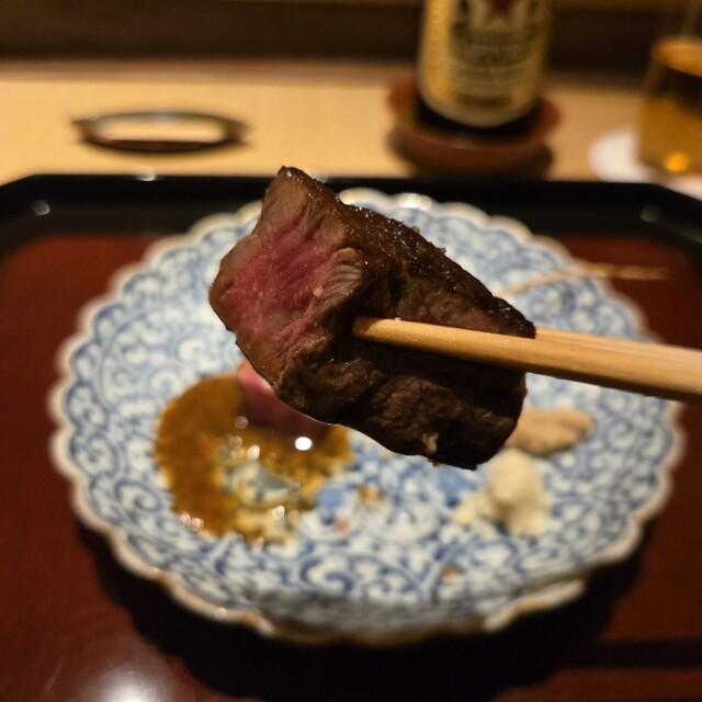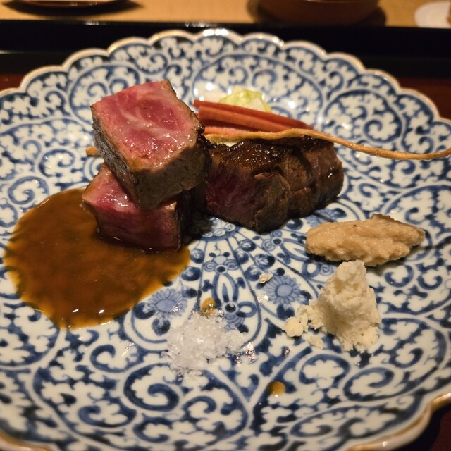 香ばしく絶妙な火入れの肉を、舞茸のペーストや山わさびなど3種のお供とともに堪能させていただきました(*>∇<)ノ