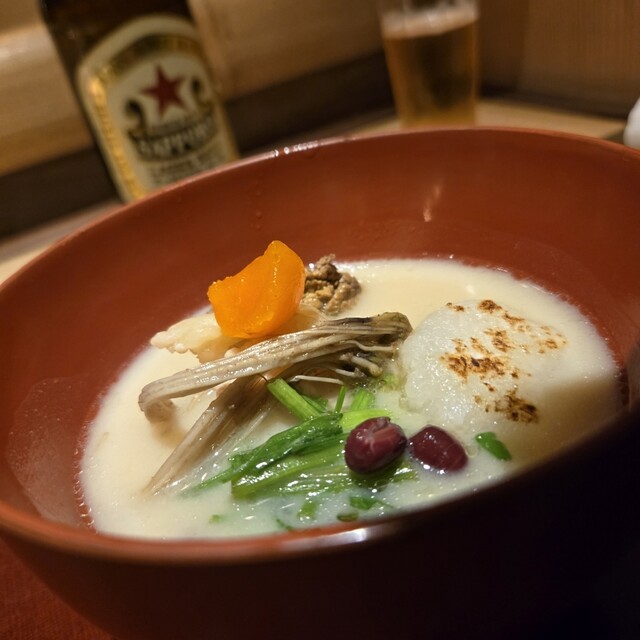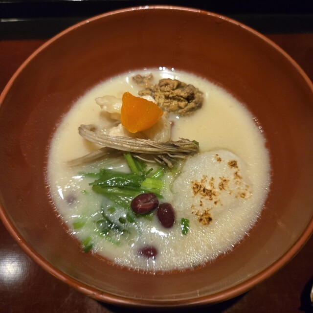 京都らしい白味噌椀、乾燥前の生の小豆を投入していただきますと、たちのぼってくる香りと、口中に広がるやさしい甘さと旨味が五臓六腑に沁みました(*´з`)