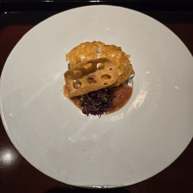 ⑥雲子焼き 蓮根せんべい 赤い水菜 赤玉葱酢