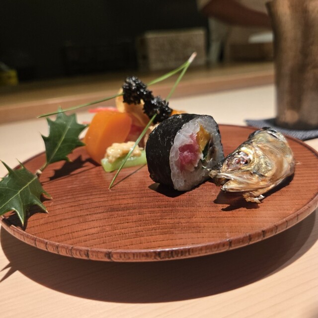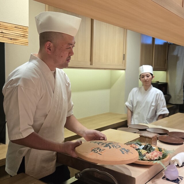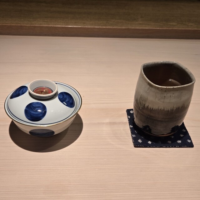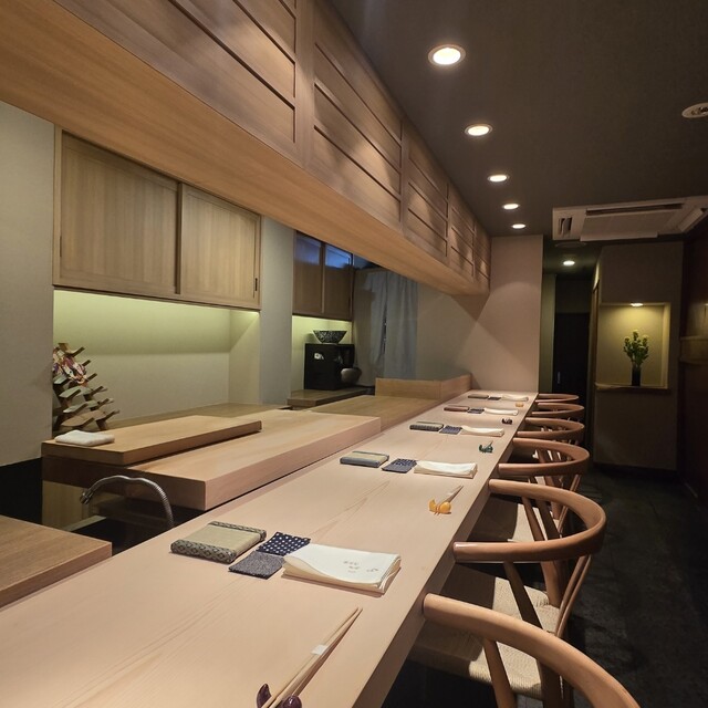 OMAKASEからの予約により伺い、細い動線の先に広がる、凛とした雰囲気の店内、小川 晴行大将方に迎えていただき、カウンター席に案内いただきました。