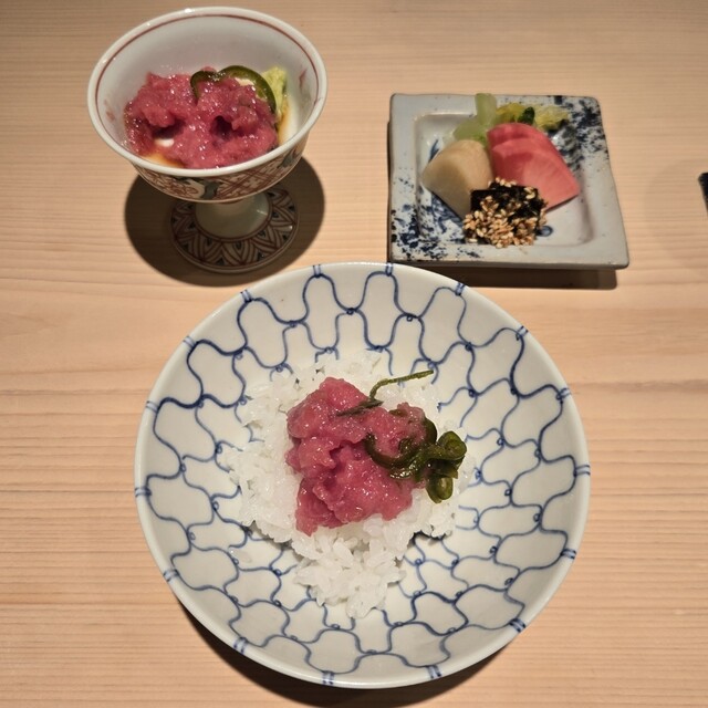 ⑫佐渡島の棚田産コシヒカリの炊きたて塩にぎり 鮪突先とピーマン醤油漬と山葵 香の物
