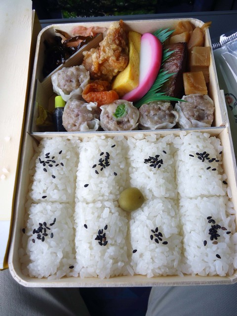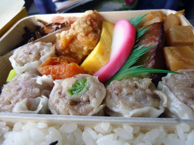 そんなワケで珍しく昼ごろ新幹線に乗るので、東京駅構内のフツーのお弁当売店で崎陽軒の「シュウマイ弁当」を買いました。750円と駅弁の相場価格としては、お手頃です。