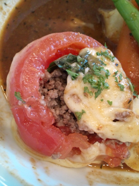 今月のメニューでもある「肉詰めトマトと三種チーズのオーブン焼きスープカレー」というメニューを注文しました。