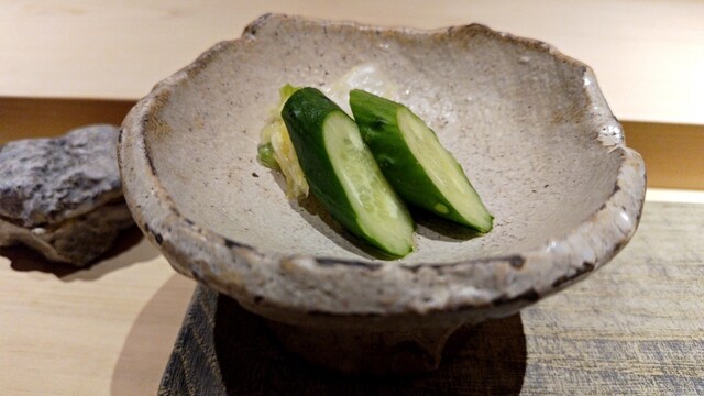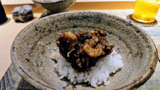 先付け、お造りと出されたあとレア、ミディアムレアと揚がった海老天ぷらからはじまりました。