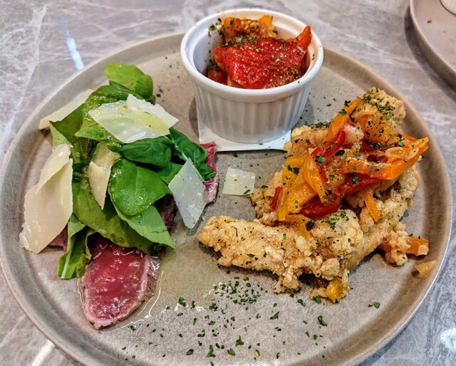 前菜の鮮魚のカルパッチョは、軽やかなオリーブオイルと塩のバランスが絶妙。メインの仔牛フィレローストは、柔らかくしっとりとした火入れで、濃厚な赤ワインソースとの相性も抜群。特製ボロネーゼは、モチモチ食感の麺に肉の旨味が溶け込んだソースがたっぷり絡み、満足度高し。デザートのティラミスも甘さ控えめで、食後にぴったりの一品。