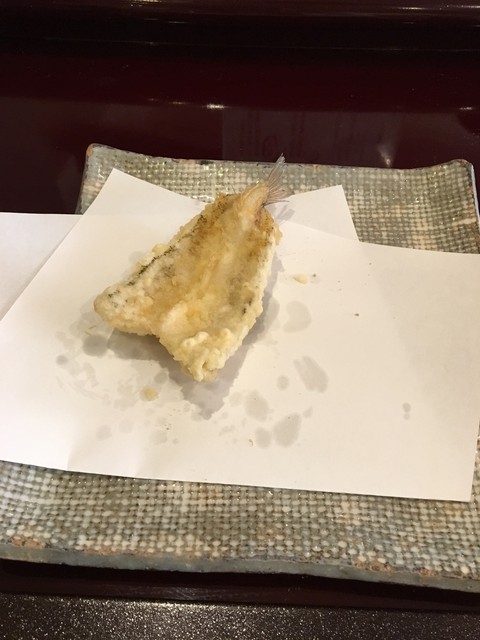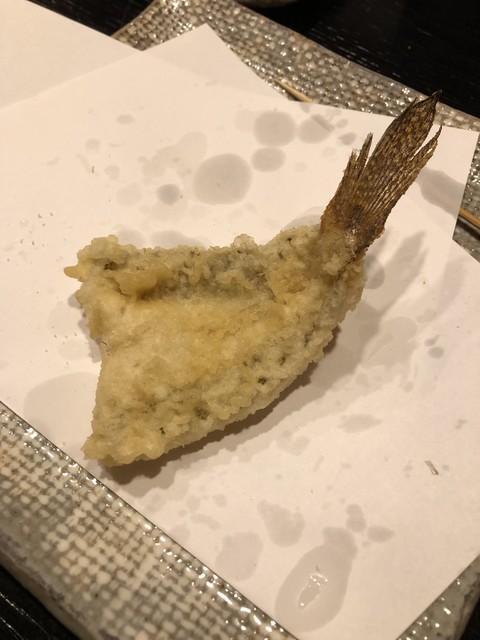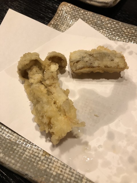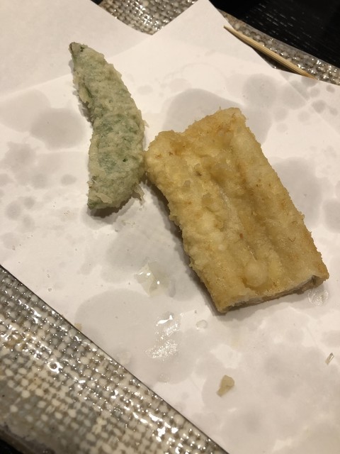 えび2匹、あこや貝、わかさぎ、えんどう豆、野菜名前失念、魚名前失念、丹波しめじのトリュフ塩、ごぼう、イカ、ホタテ、スナップエンドウ、穴子?