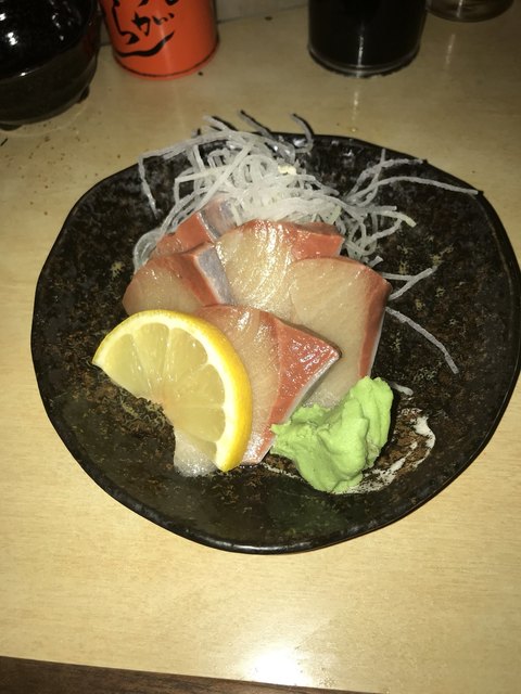 寒ブリの刺身(450円)。これは養殖ブリだった。レビューでこの店の魚の刺身は高評価だが、このブリに関しては味はイマイチ。(養殖物なのでやむなし。)ただし、価格を考えれば価格以上の価値はあり。