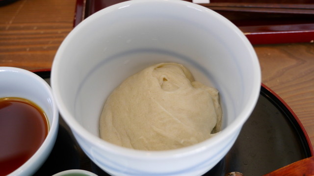 暖かいふんわりしたそばがきをだしに付けて食べます。