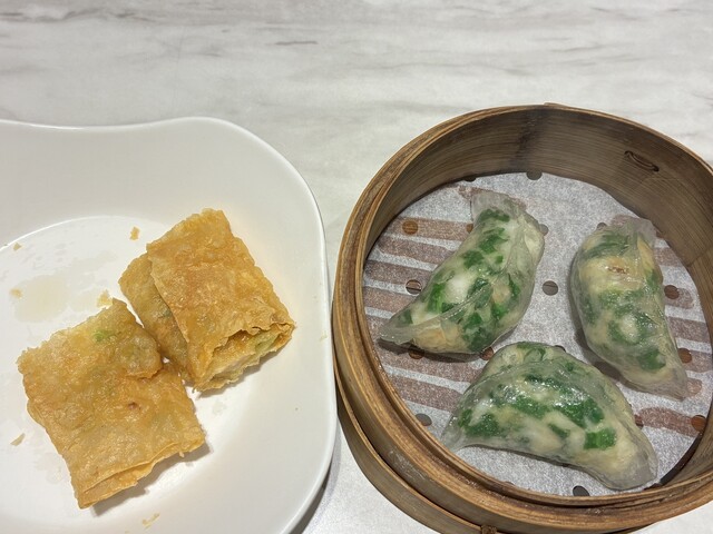 海老ワンタン麺、海老の湯葉春巻き、海老と韮の蒸し餃子を頼みました。