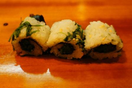 真鯛で雲丹を巻いてあります マグロ 中トロ位かな 梅味噌