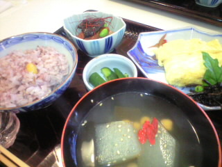古代米を混ぜて炊いたご飯と冬瓜のお吸い物、大きなダシ巻きに煮物やお漬物・・・
