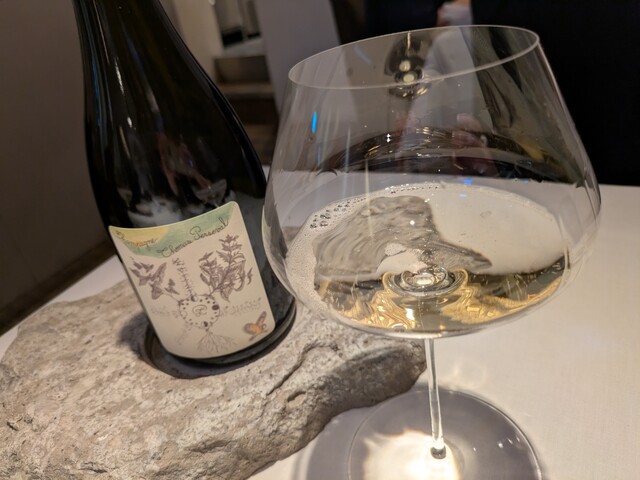 和牛とアワビを合わせた一品ですが、アワビ肝ソースのほろ苦さと、お肉の血の気をあわせてペアリングも噛ませてきます。